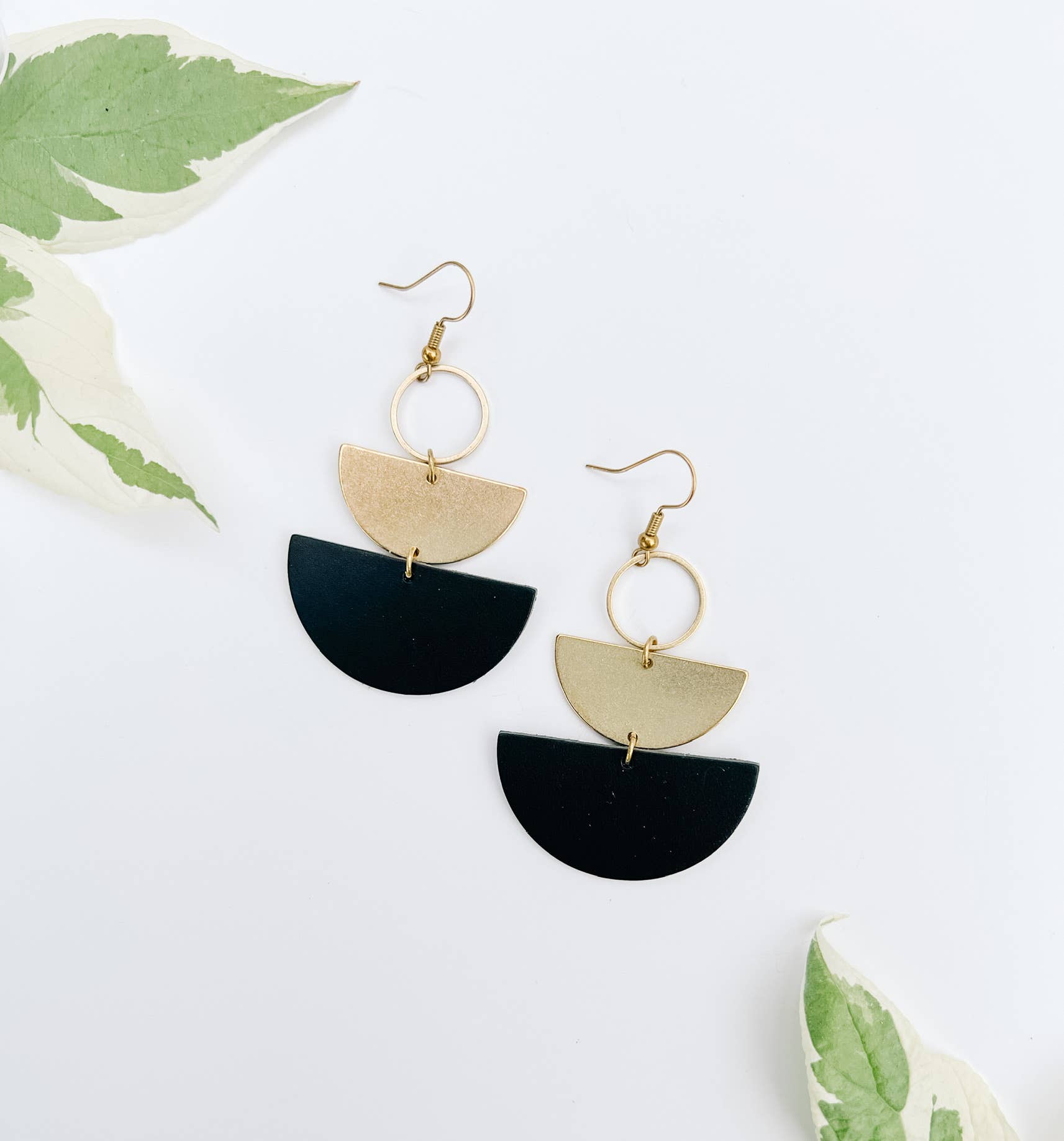 Black Leather & Brass Accent Half Moon Stacked Dangle Earrin