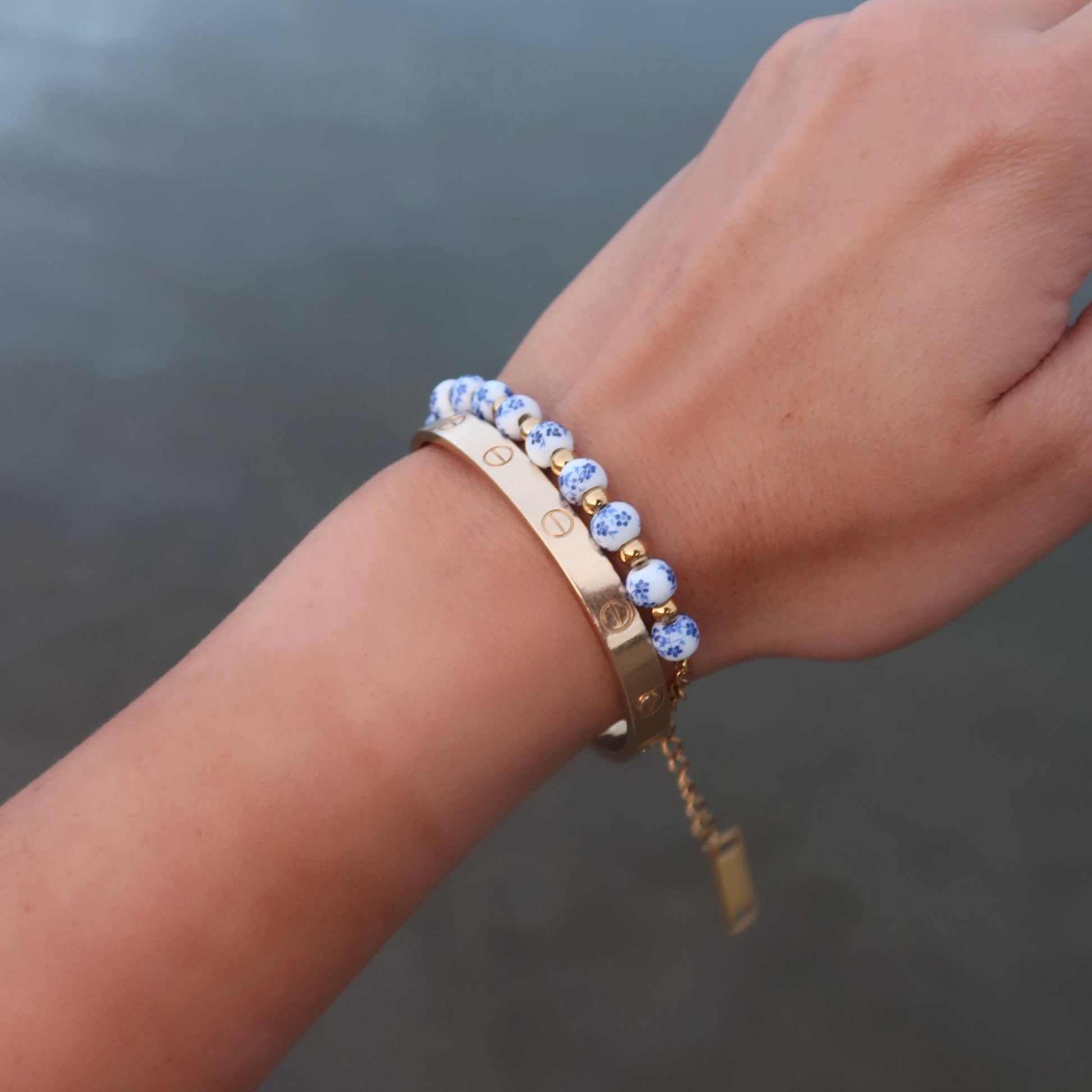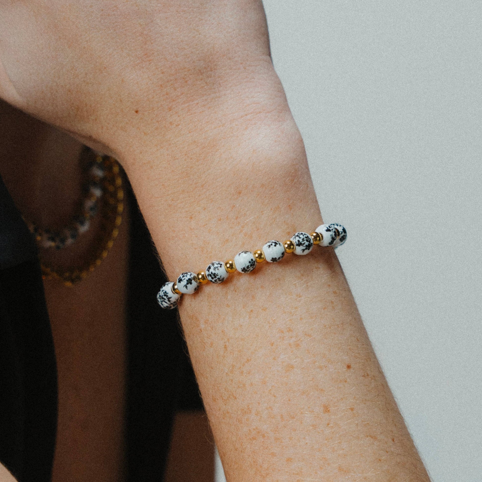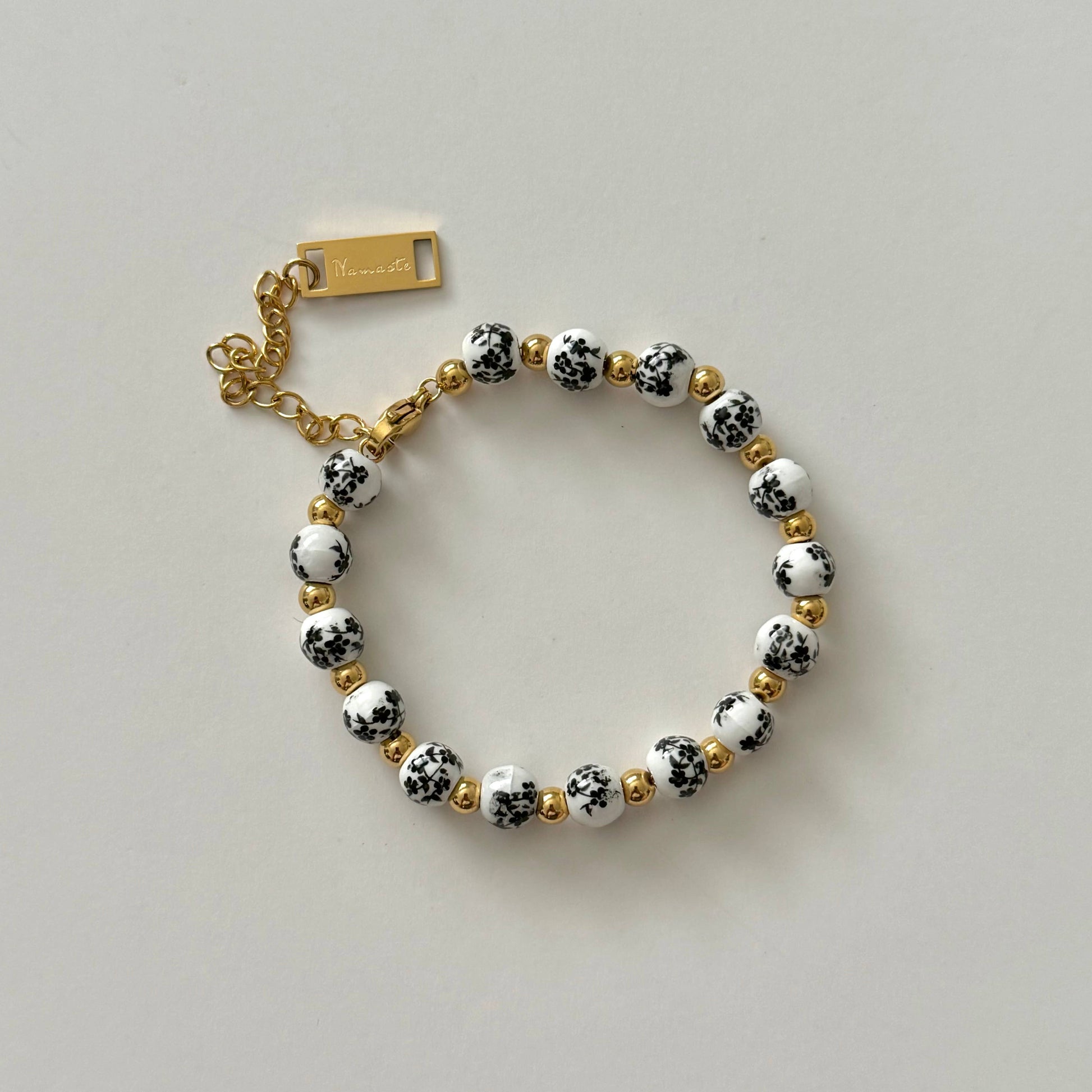 Bracelet made of ceramic beads adorned with delicate floral designs.