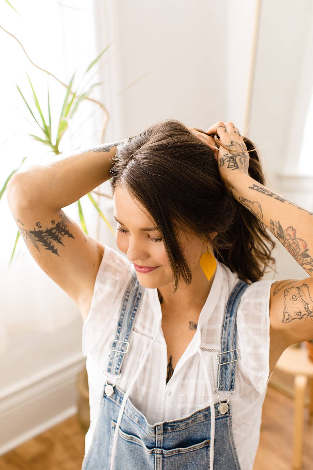 Our genuine leather earrings are hand-cut therefore each piece is unique. We also pay close attention to the natural variations, wrinkles, and creases of the leather which adds to the popular slightly distressed look. Pairs are very closely matched, but some variations are to be expected and your earrings may not be identical to the earrings pictured.
